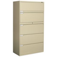 5 Drawer Lateral File, 4 fixed front drawers plus top drawer with receding door and roll-out shelf. Electronic Lock factory installed. Placed in standard key position for each model.