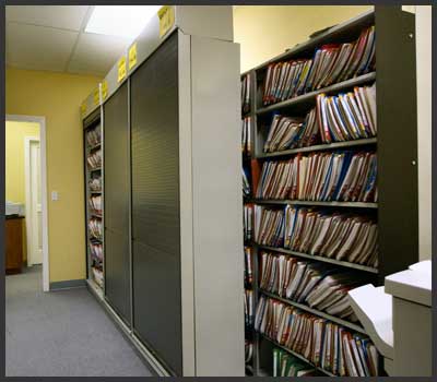 The HD2 system is extremely versatile and can have hinged or tamber locking doors installed to meet HIPPA requirements. The system can incorporate traditional lateral file cabinets, stack boxes ,bookshelves as well as standard shelving. Examples shown include a filing system where the carriages move to provide access to the back row, commonly known as a bi-file. Another shows two rows of shelving in front of the stationary, commonly known as a tri-fle.