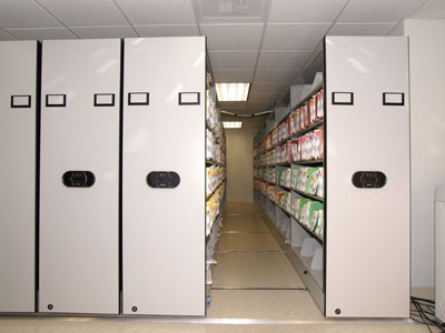 Our HD5 Storage Systems have carriages made of a special 6061 structural grade aluminum extrusion with a 5/8” retaining lip. Carriages are fully welded in a jig to insure they are straight and square. Carriages have a 1000 pound per foot capacity, 5” dual flanged guide wheels with a capacity of 7000 pounds per wheel assembly. Drive wheels are connected to a continuous 1” solid steel drive shaft the carriages ride on a special aluminum extrusion fitted with a 3/4” 1045 carbon steel bar. Carriages are available up to 60” wide and 50’ long and are custom made to fit any sturdy shelving or other storage products.