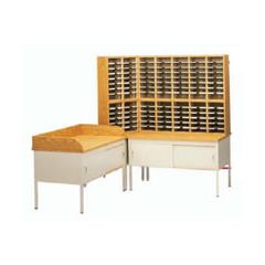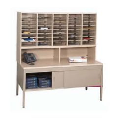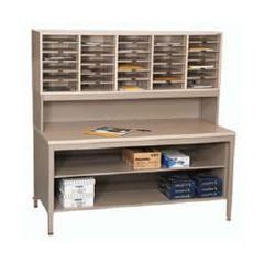 Mail sort workstation #5 is made up of a CTA style open table with adjustable intermediate shelf for added storage. 12" high RMP riser brings sorting to eye level and keeps entire work surface open. Sorts adjust in 1" increments. Provides 30 openings. Customizable mail sort systems for distributing mails, parcels and other documents. Highly configurable to maximize space, workflow and productivity.