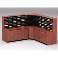 Image shown (item no. 1808) with 8 under table top pull-out storage drawers, 4 can be used as a mail drop with mail cutout above them. Upper storage cabinets with swing doors for extra storage. Each pocket is adjustable in 1" increments.