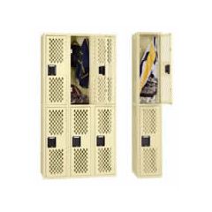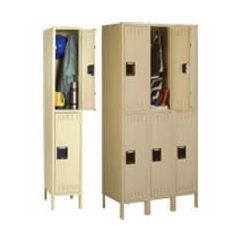 Lockers with legs. Double-tier steel personal lockers feature two openings per locker, giving you twice as many lockers in the same space, yet providing plenty of hanging room for shirts and jackets. Lockers available in single or three-wide units. Opening sizes of 12" or 15" wide and depths of 12", 15" or 18". Three (3) single prong coat hooks. Positive 2 point locking system on doors. Door stiffeners. Louvers for ventilation.