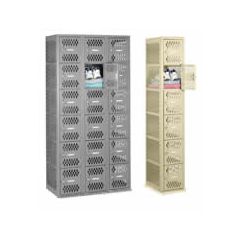 Six-tier high steel box lockers featured single or three-wide units. Opening sizes of 12" or 15" wide and depths of 12", 15", or 18". Rugged padlock hasps. Louvers for ventilation.