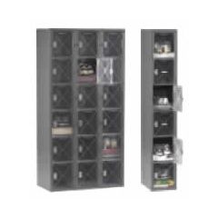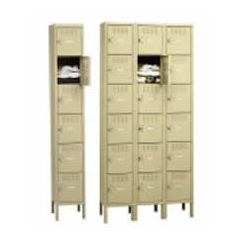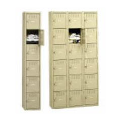 Six-tier high steel box lockers featured single or three-wide units. Opening sizes of 12" or 15" wide and depths of 12", 15", or 18". Rugged padlock hasps. Louvers for ventilation