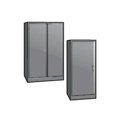 Choose cabinets for office supplies storage, wardrobe storage, combination or counter high unit. Cabinets featured adjustable shelves, knuckle-hinges, 3-point locking, built-in shelf support, reinforced doors, two brushed chrome handles, raised base, two adjustable levelers, ventilation louvers in back, heavy gauge steel, shelf capacities up to 150 lbs. on 18" deep shelves and up to 200 lbs. on 24" deep shelves evenly distributed.